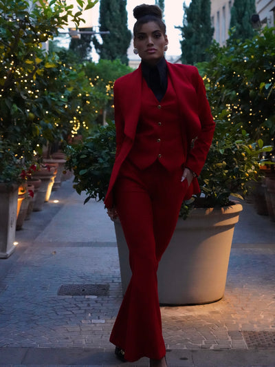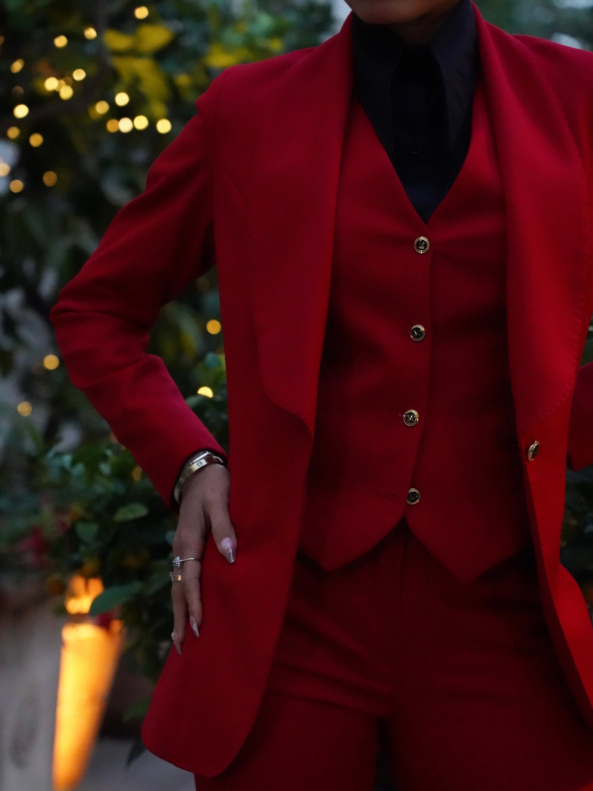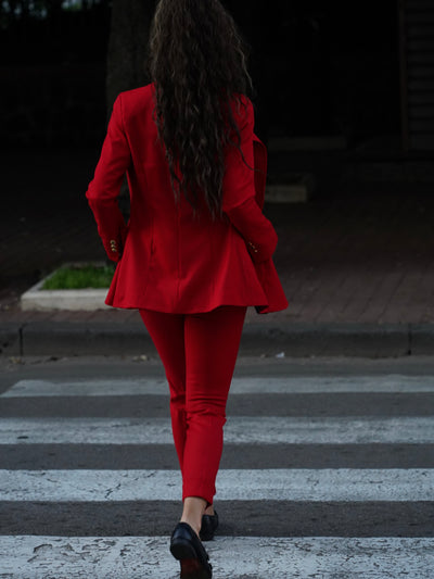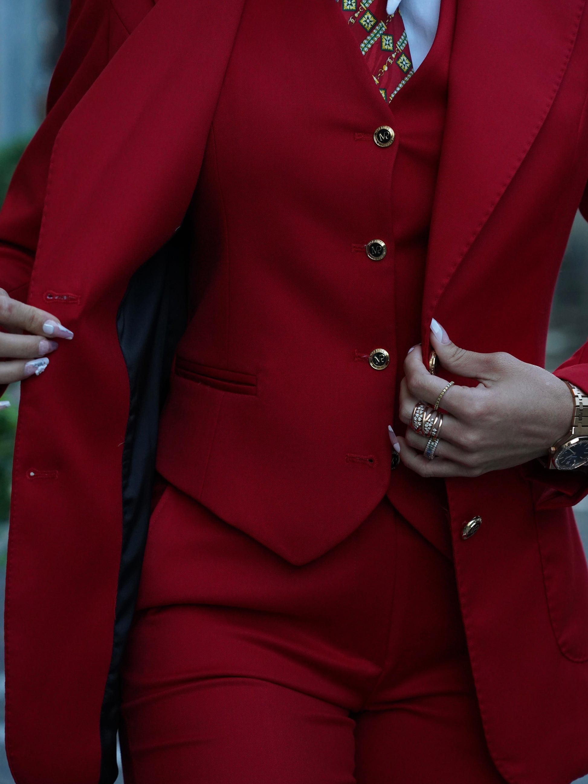 Giacca collo a scialle rosso con bottoni oro .