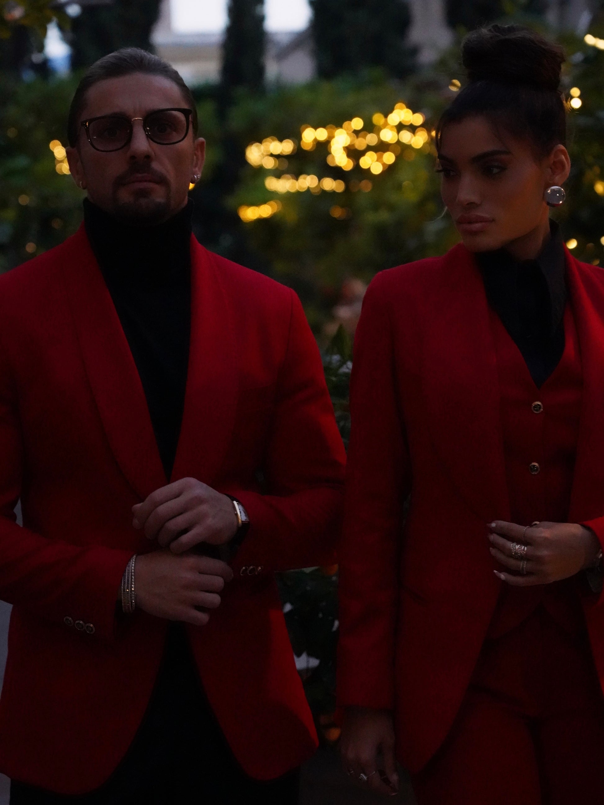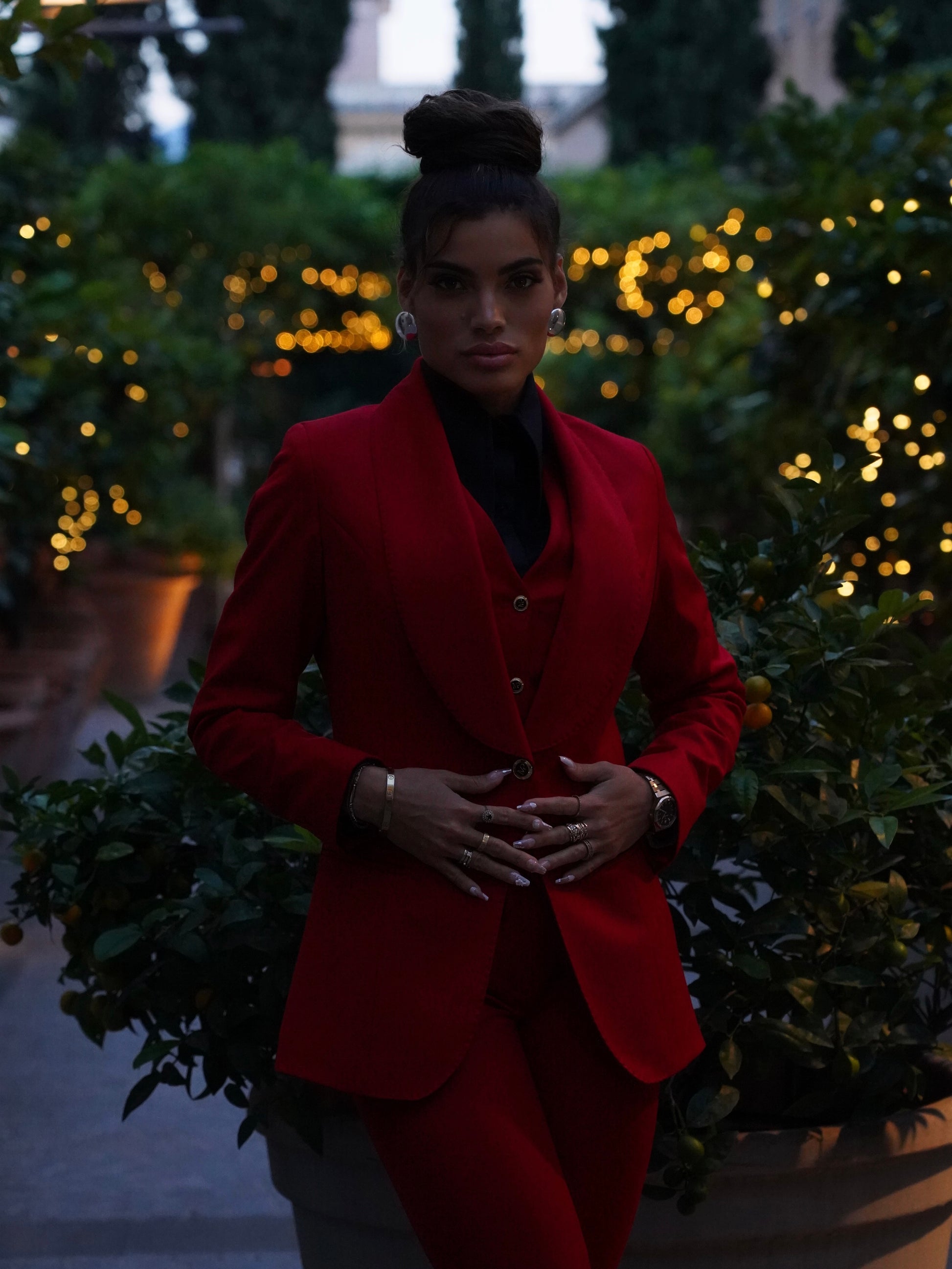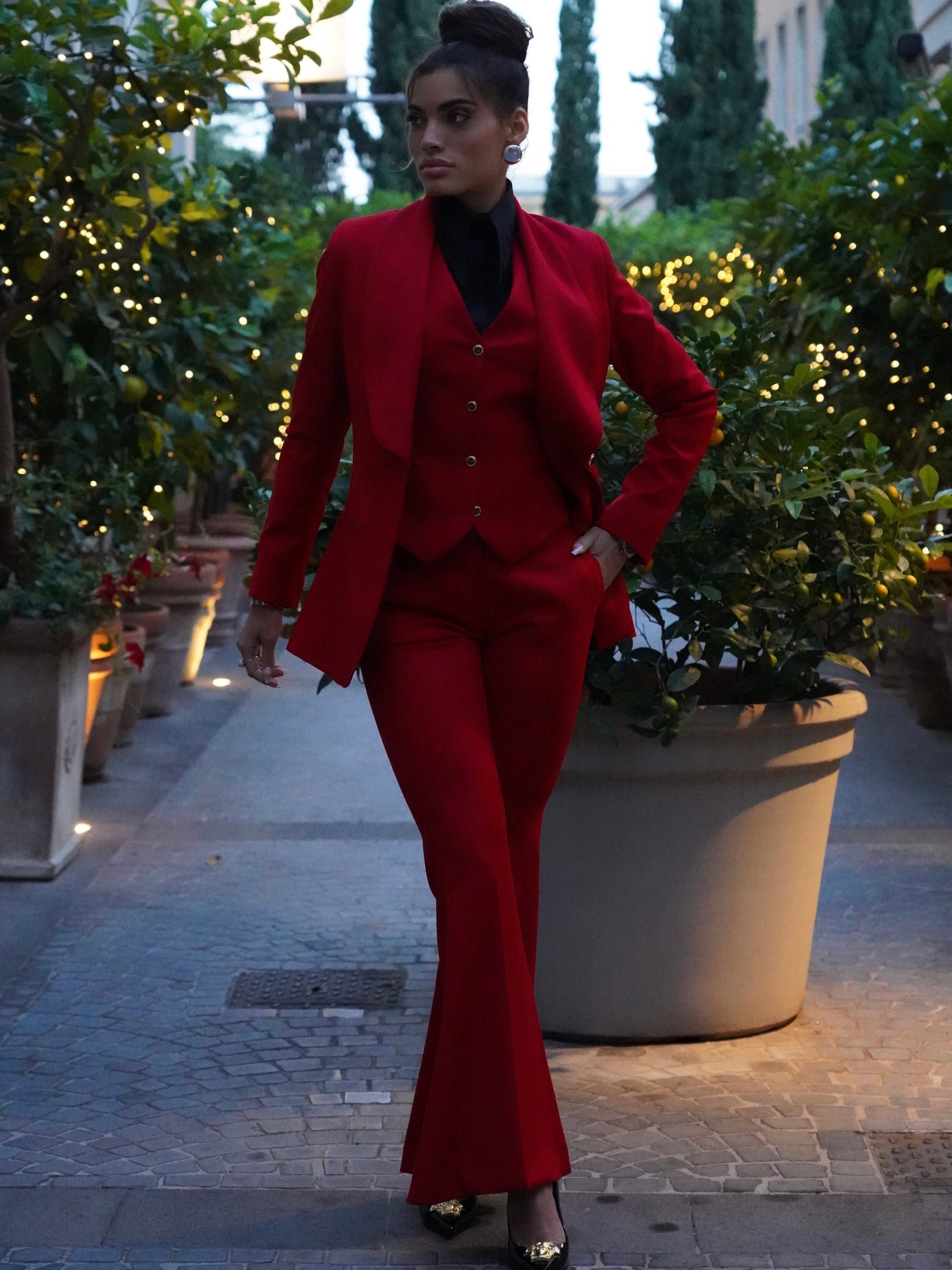 Giacca collo a scialle rosso con bottoni oro .