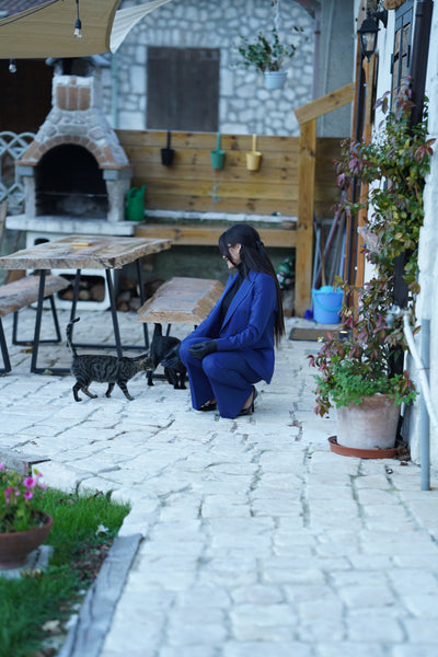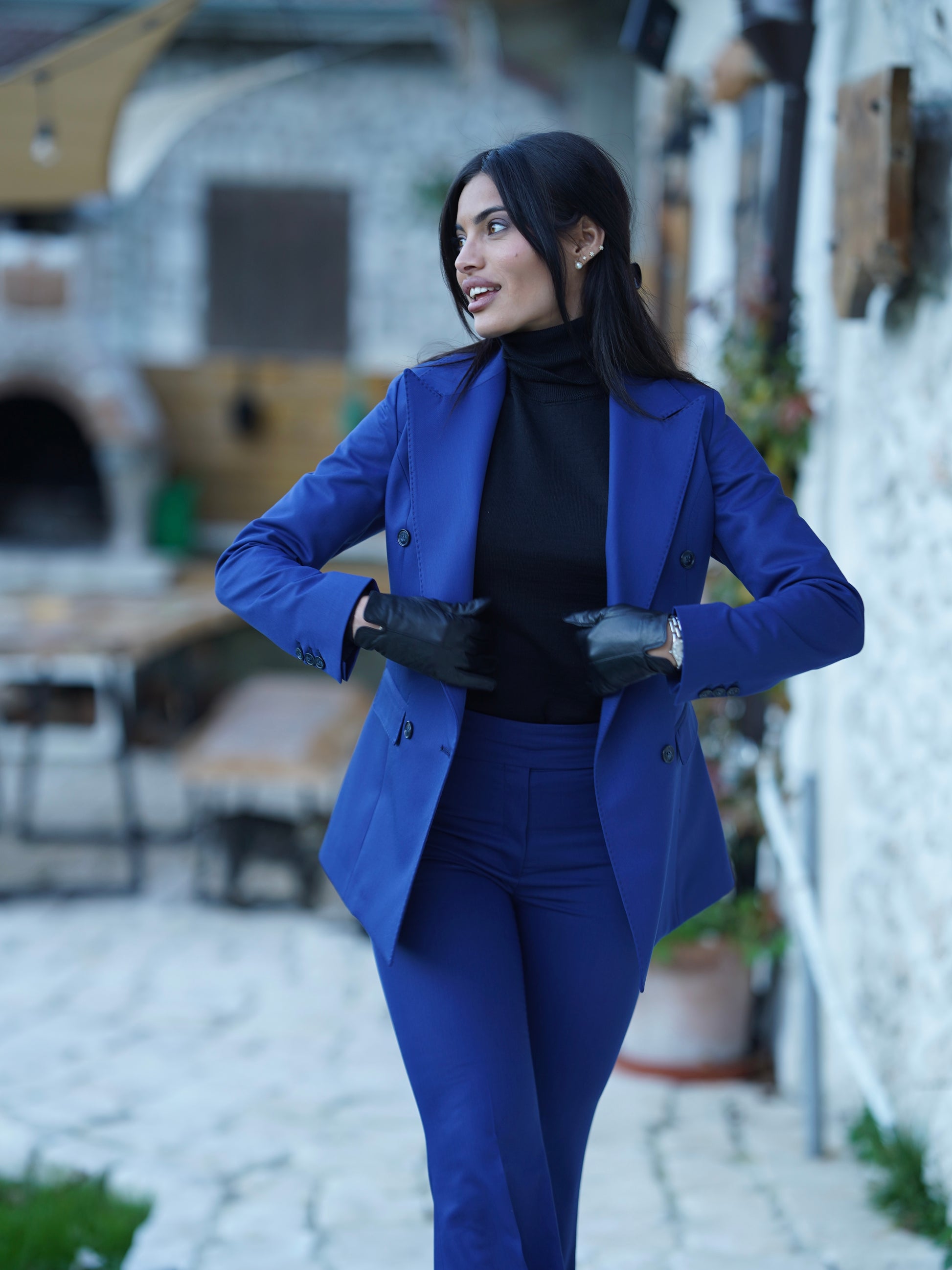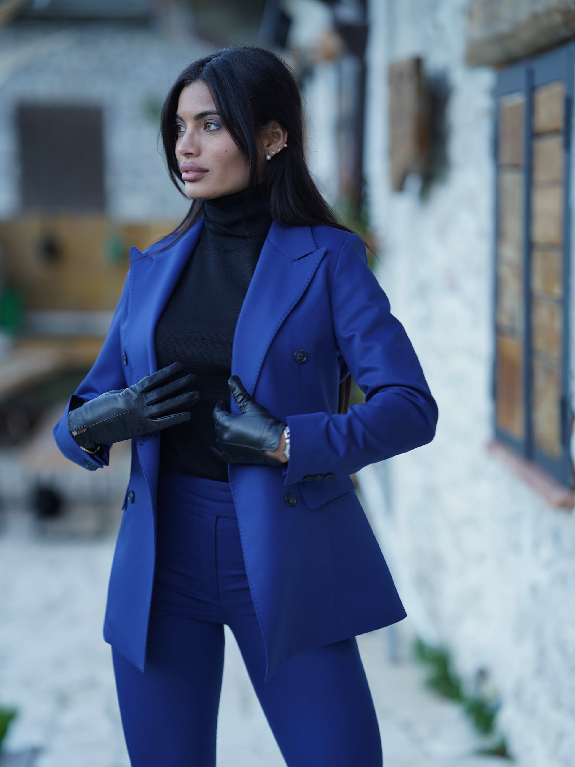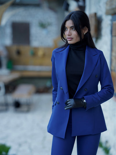 Giacca doppiopetto in lana color azzurro oltremare, caratterizzata da una linea pulita e una struttura morbida ma ben definita.