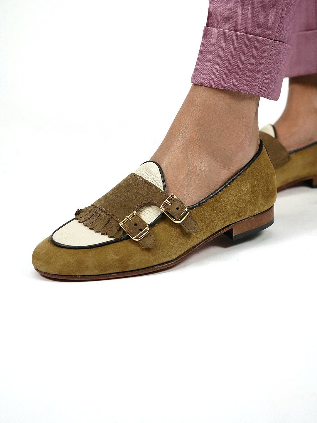 Mocassini doppia fibbia in pelle di vitello con profili tono su tono e fibbie in metallo dorato.