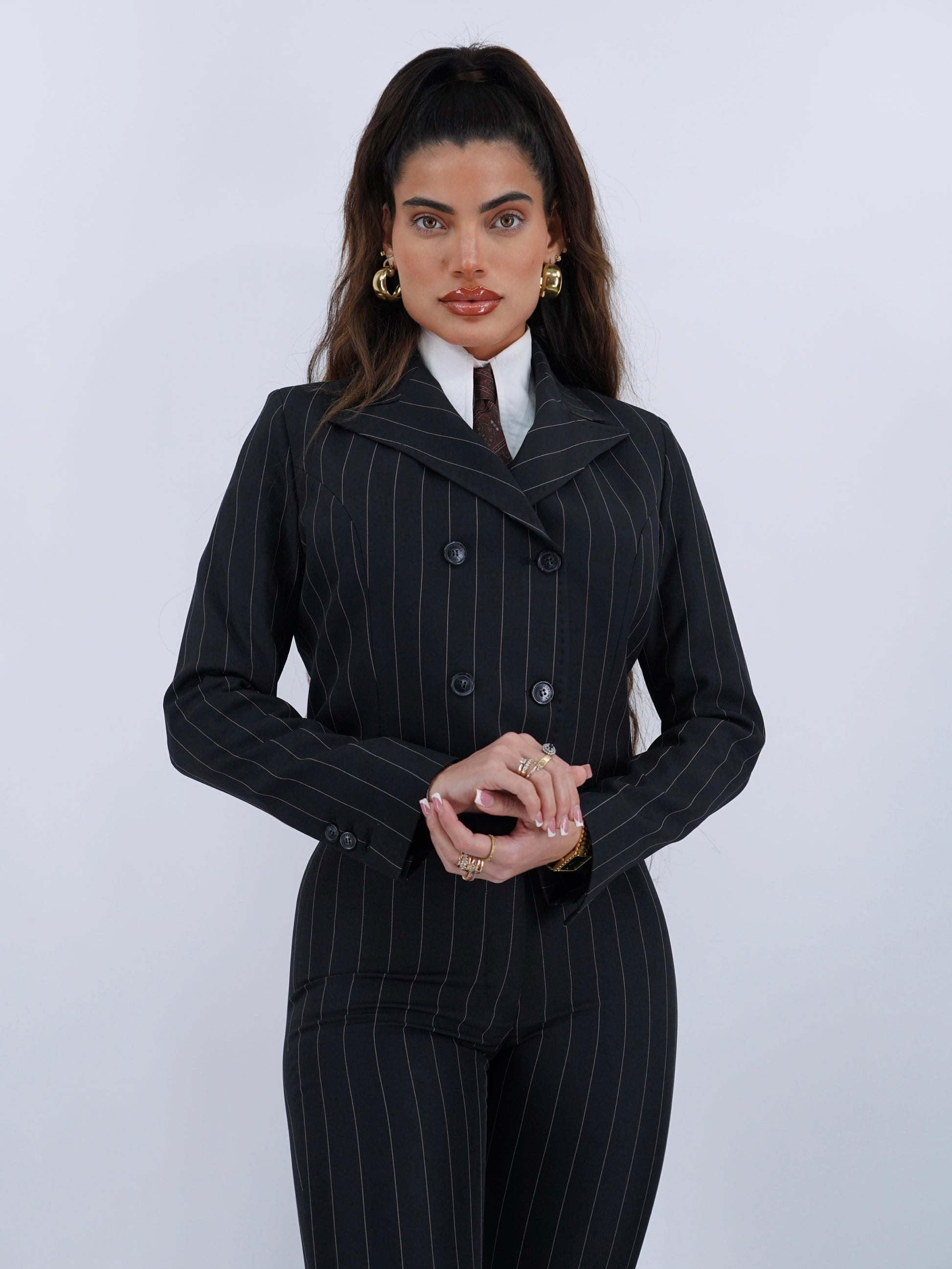 Scopri la raffinatezza e la forza della giacca doppiopetto della collezione Moraima Perez Dress, pensata per la donna che ama distinguersi con eleganza decisa.