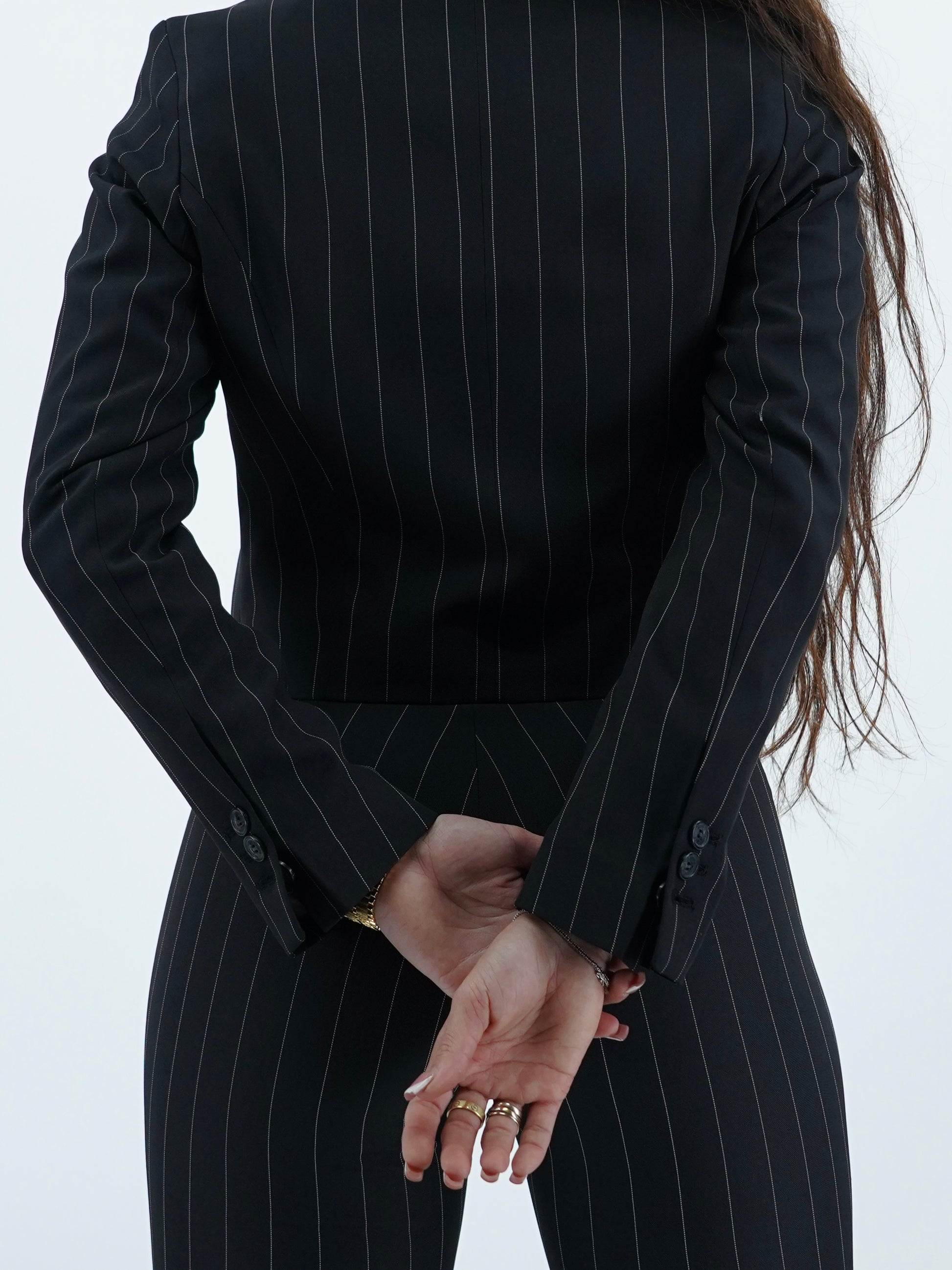 Realizzata in un tessuto gessato dal gusto intramontabile, questa giacca unisce carattere, stile e versatilità.